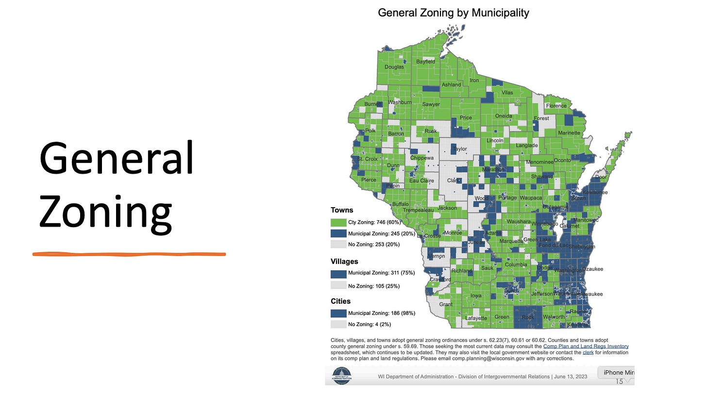 And apart from federal and state rules, how land use projects unfold is a highly local affair. Even county zoning, I’m learning, is a patchwork across Wisconsin.