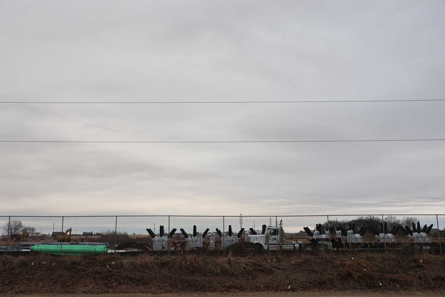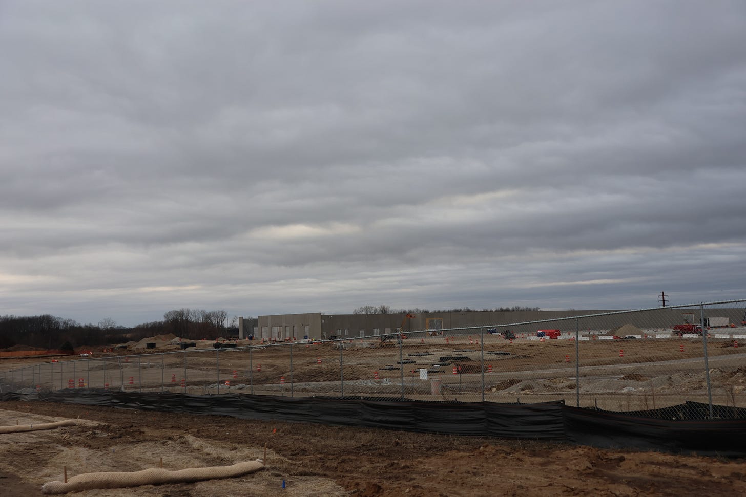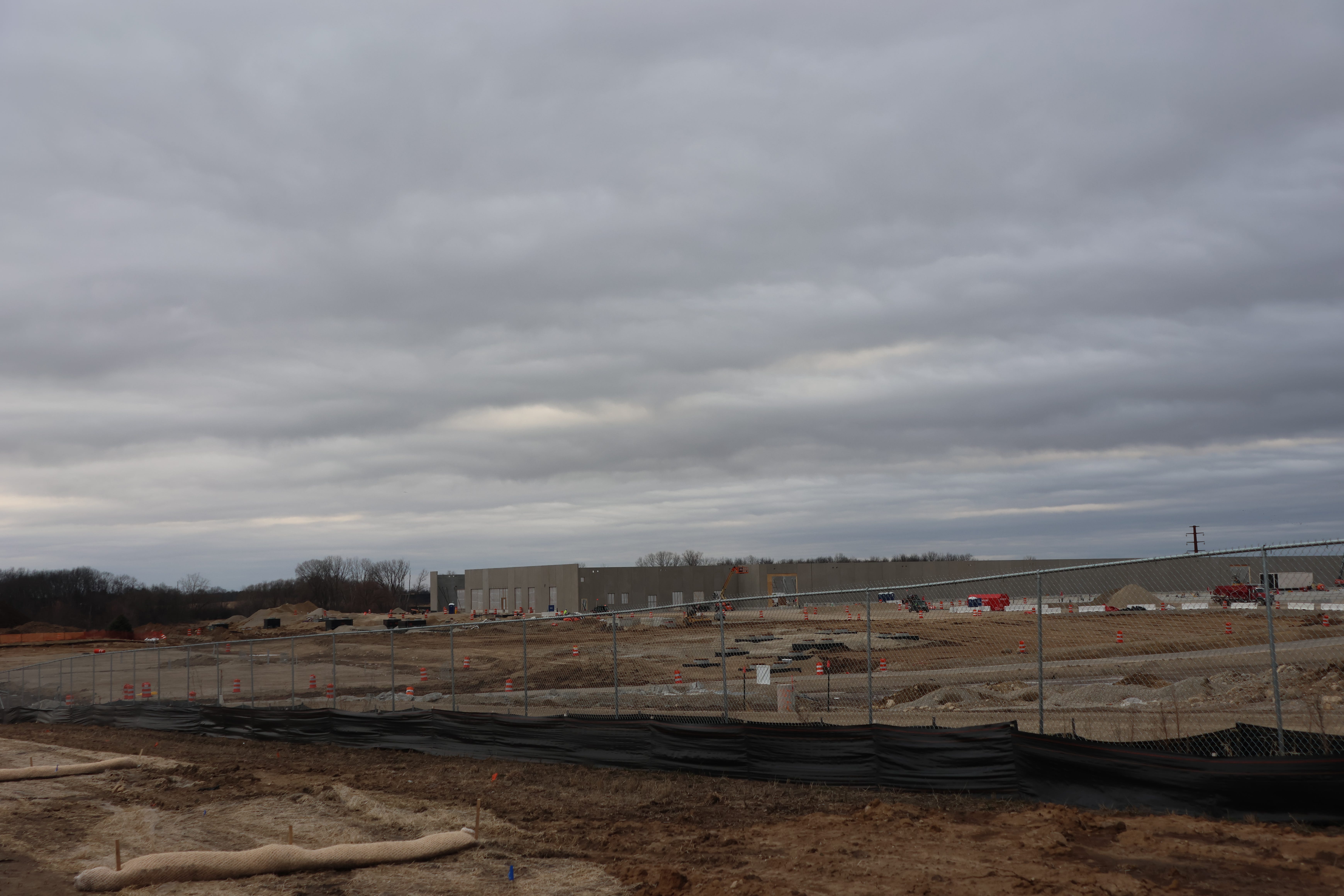 Buildings are going up at the south end of the road. As you drive up, you can see white hoop shelters. At the north end, electrical equipment to power an ATC substation is strewn out on the ground. Across the way, a brown expanse is dotted with orange flags and cones.