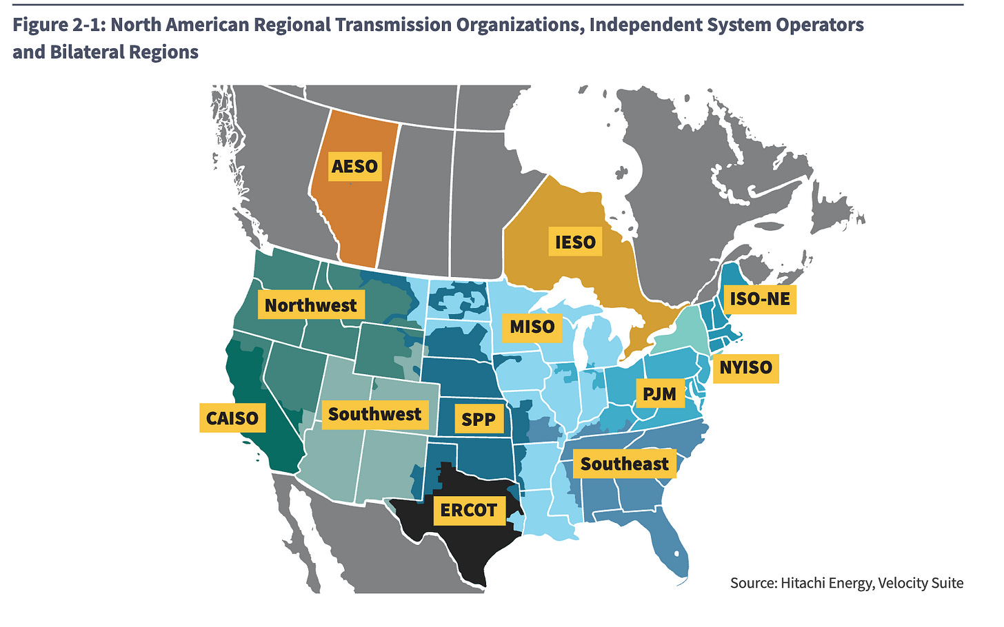 And in the ‘90s, as part of unbundling, a wave of new federal orders to break up that monopolistic control included one forcing utilities to open up their transmission lines to competitors. It’s at this stage that we start to encounter regional electricity markets, which aim to “[facilitate] open access to transmission” and “[foster] competition for electricity generation.”