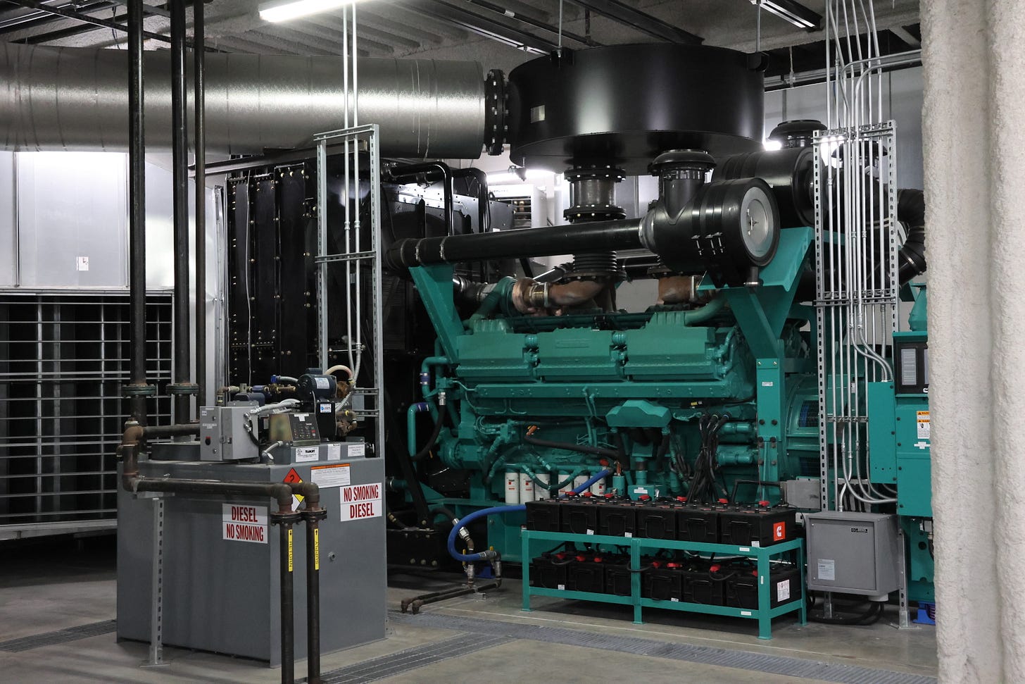 These diesel generators are in their own dedicated room. They’ve never been needed in an emergency but are regularly tested. They’re kept inside thick indoor walls, and the cacophony of running them doesn’t reach outside the building. Above the generators are special hoods which catch and filter the exhaust instead of running it into the atmosphere.