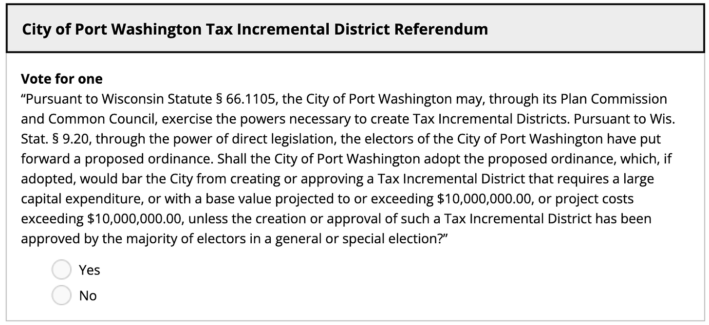 So how did Port Washington get this passed? They used a section of state law that allows electors in villages and cities to place legislation on the ballot. Towns, interestingly enough, don’t have the same right of direct legislation under a 2023 Supreme Court decision, I noticed.