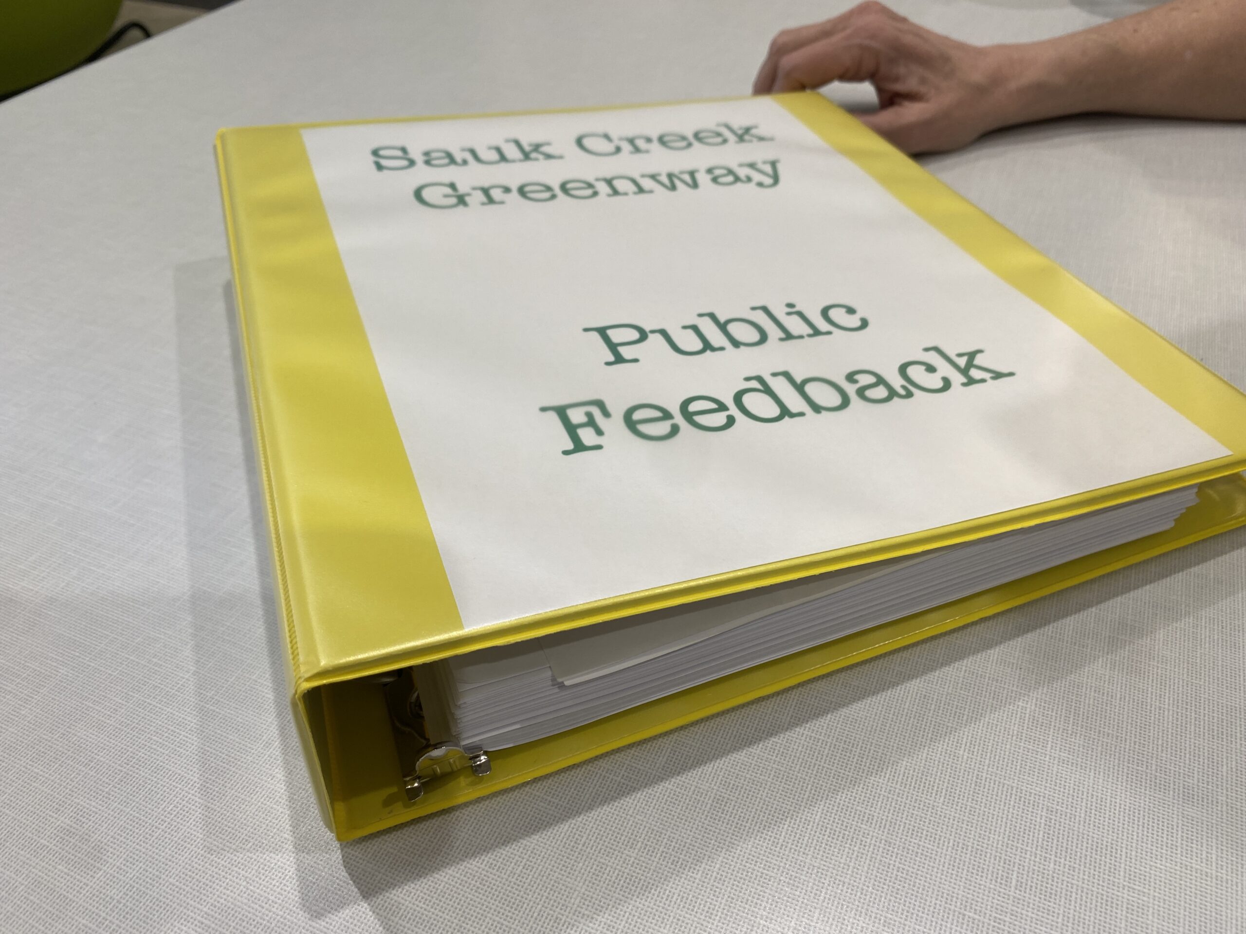 Recently, she’s been helping to lead the neighborhood’s push against another proposed city improvement – a potential bike and pedestrian path running through the greenway. She’s been regularly attending transportation and planning meetings, and even brought her bright yellow binder to Tuesday’s meeting.